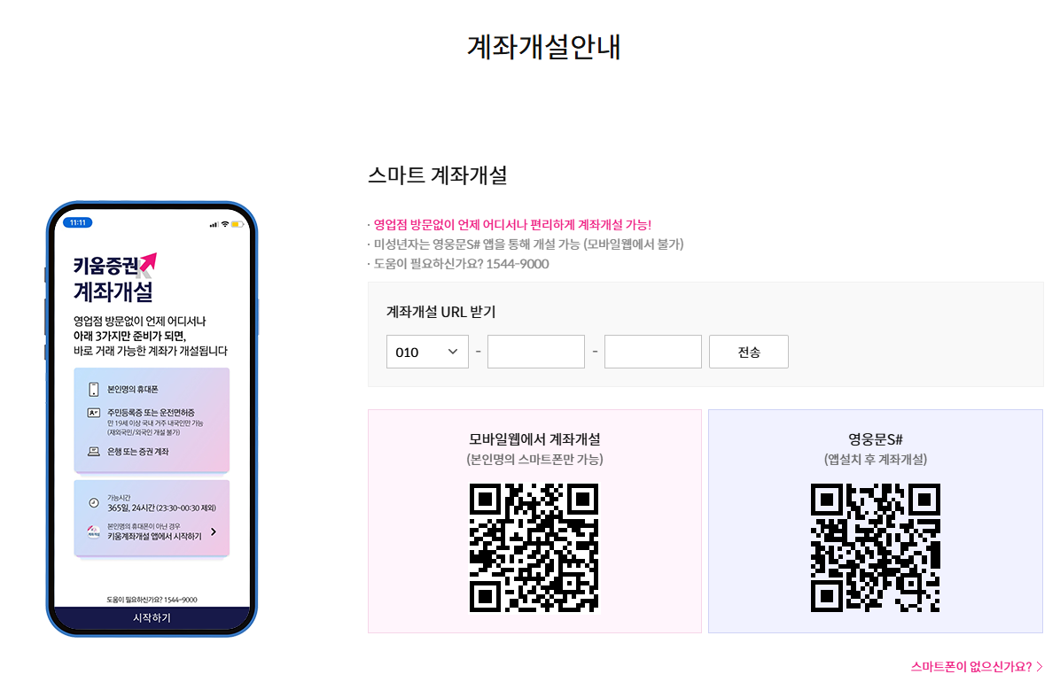 구글 플레이스토어 또는 애플 앱스토어에서 '키움증권 계좌개설'을 검색하여 전용 앱을 설치합니다. (거래용 앱인 '영웅문S#'에서도 개설이 가능하지만, 처음에는 계좌 개설 전용 앱이 더 직관적입니다.)