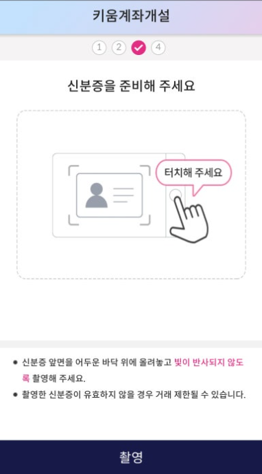 안내에 따라 준비된 신분증을 촬영합니다. 가장 오류가 많이 나는 단계이니 아래 팁을 꼭 확인하세요.