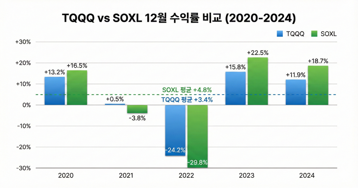 - TQQQ 12월 평균 수익률 +12.5% vs SOXL +15.8% → SOXL이 3.3%p 높음